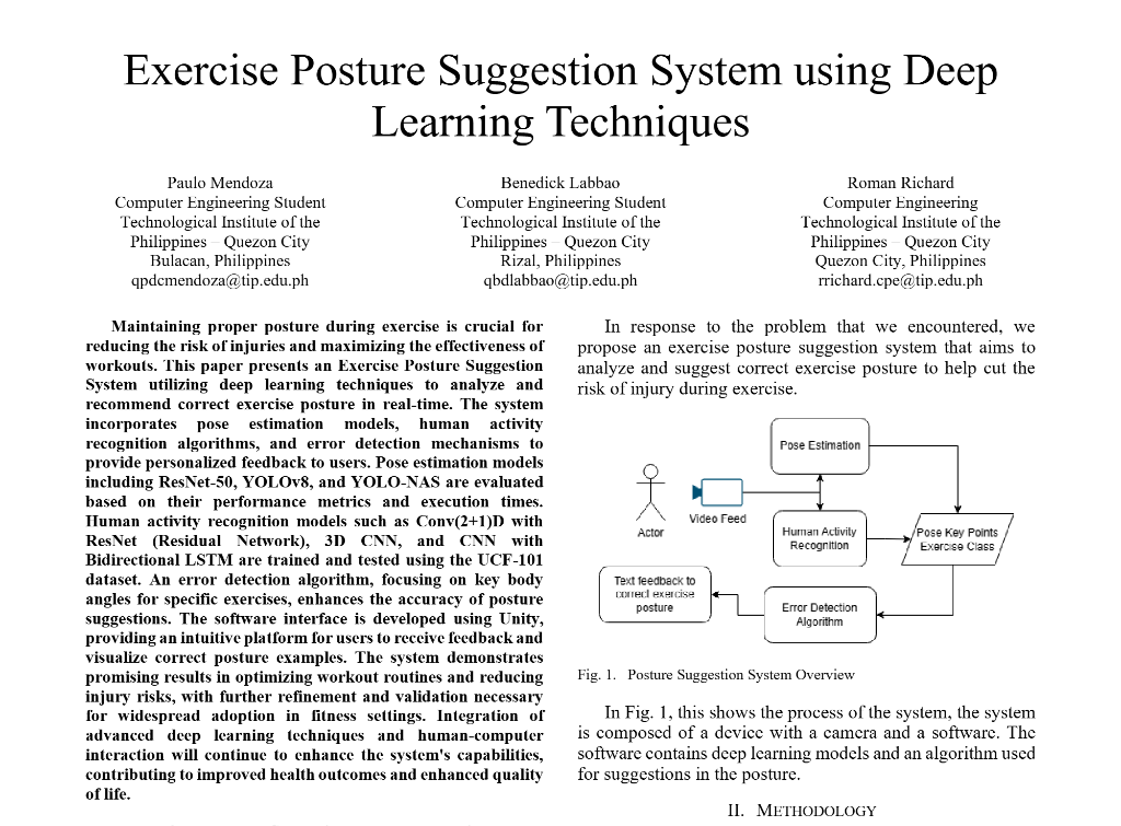An Exercise Posture Suggestion System using deep learning to analyze and provide real-time feedback on correct exercise posture. Integrated pose estimation, human activity recognition, and error detection algorithms to offer personalized guidance. The software interface, built in Unity, allows users to visualize correct postures and optimize workouts, aiming to reduce injury risk and improve exercise effectiveness.