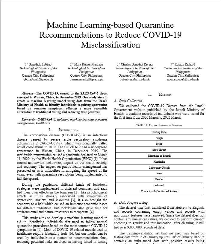 A Research about Machine learning models using Israeli Ministry of Health data to predict individuals requiring quarantine based on common COVID-19 symptoms, offering a faster, accessible alternative to testing while reducing false positives.